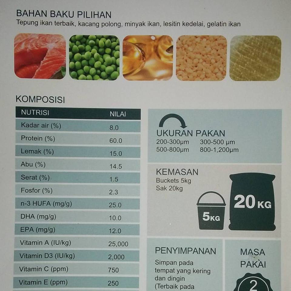 Kandungan proteinnya cukup tinggi [55%], sangat bagus untuk pertumbuhan ikan, tapi harga pelet impor ini lumayan mahal. Tersedia berbagai ukuran untuk burayak sampai ikan dewasa.